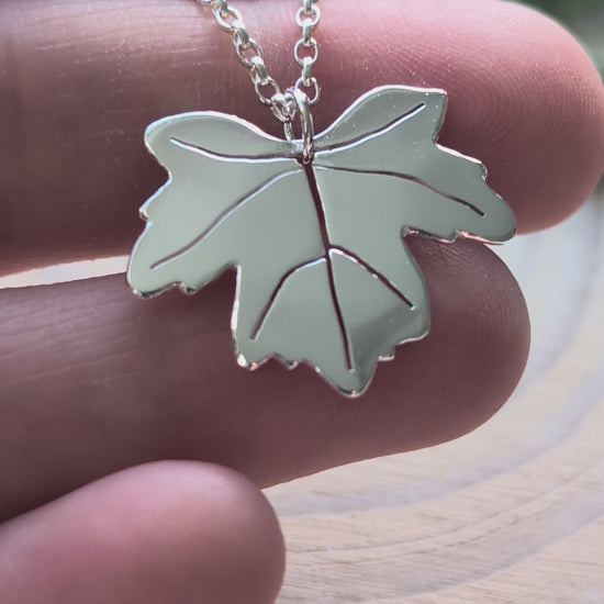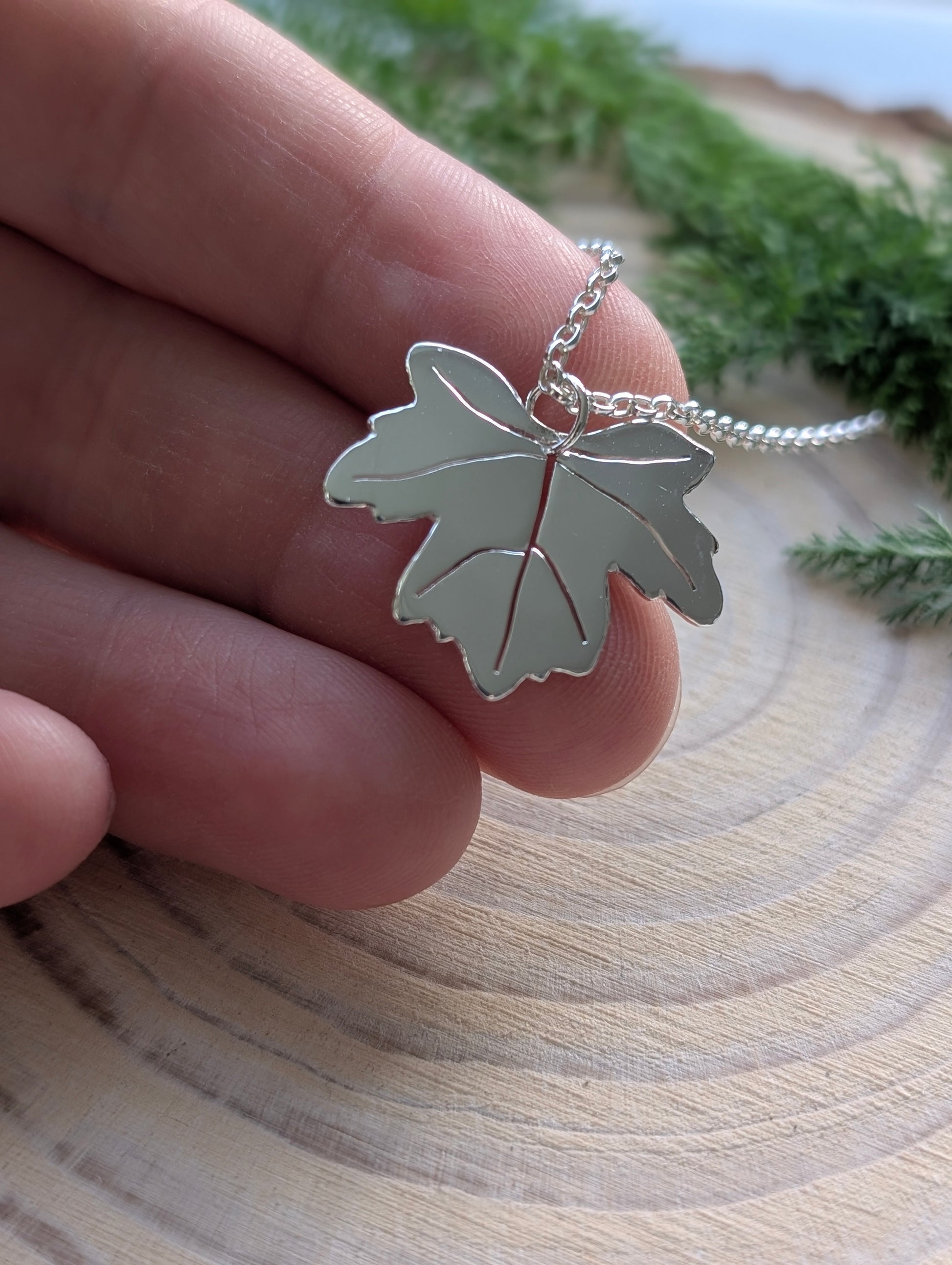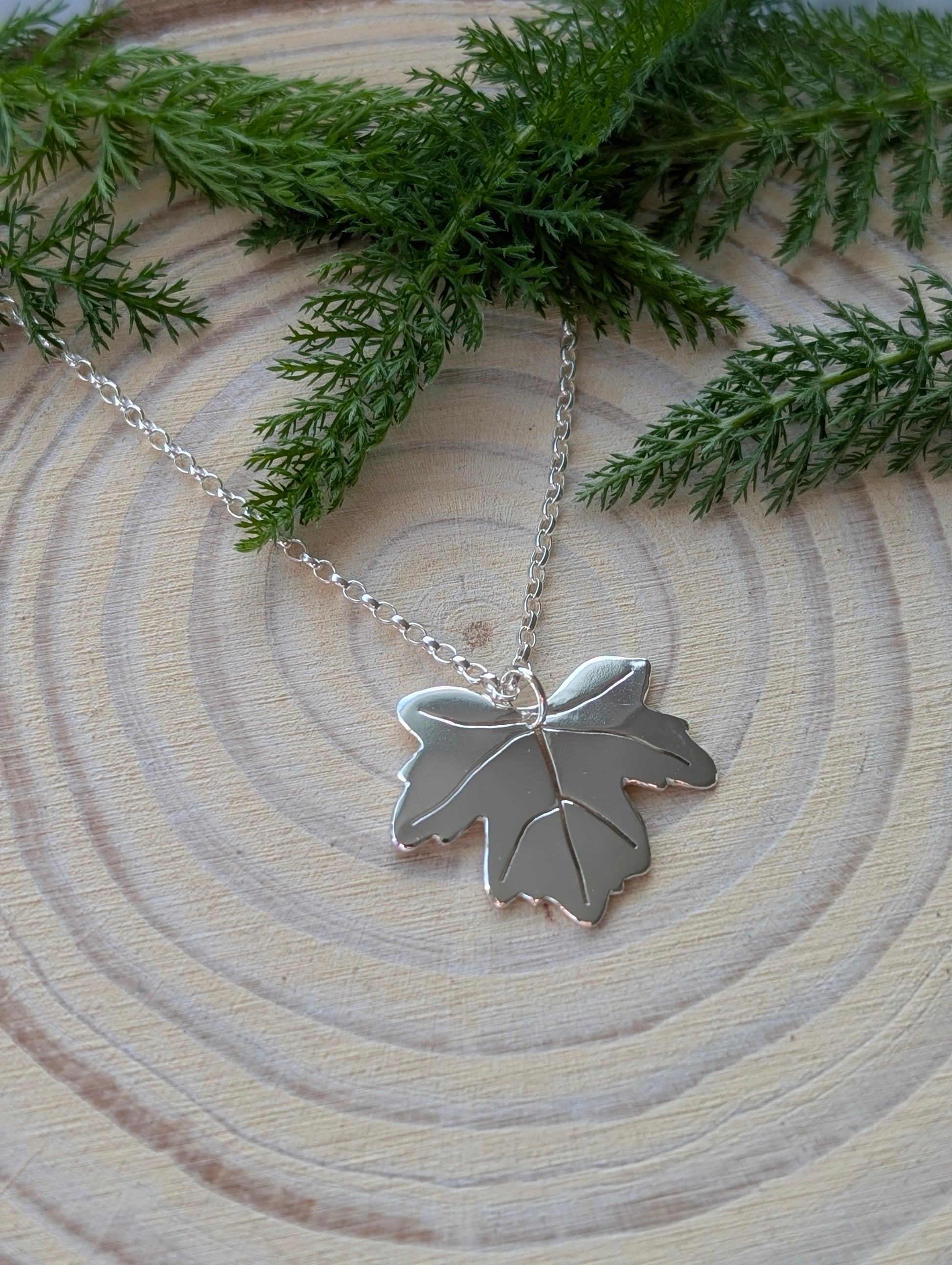 This beautiful silver maple leaf necklace would make a great gift for the nature lover and jewellery lover alike. Featuring hand sawn detail, it is displayed on a sterling silver belcher chain which is adjustable from 18 to 20 inches.