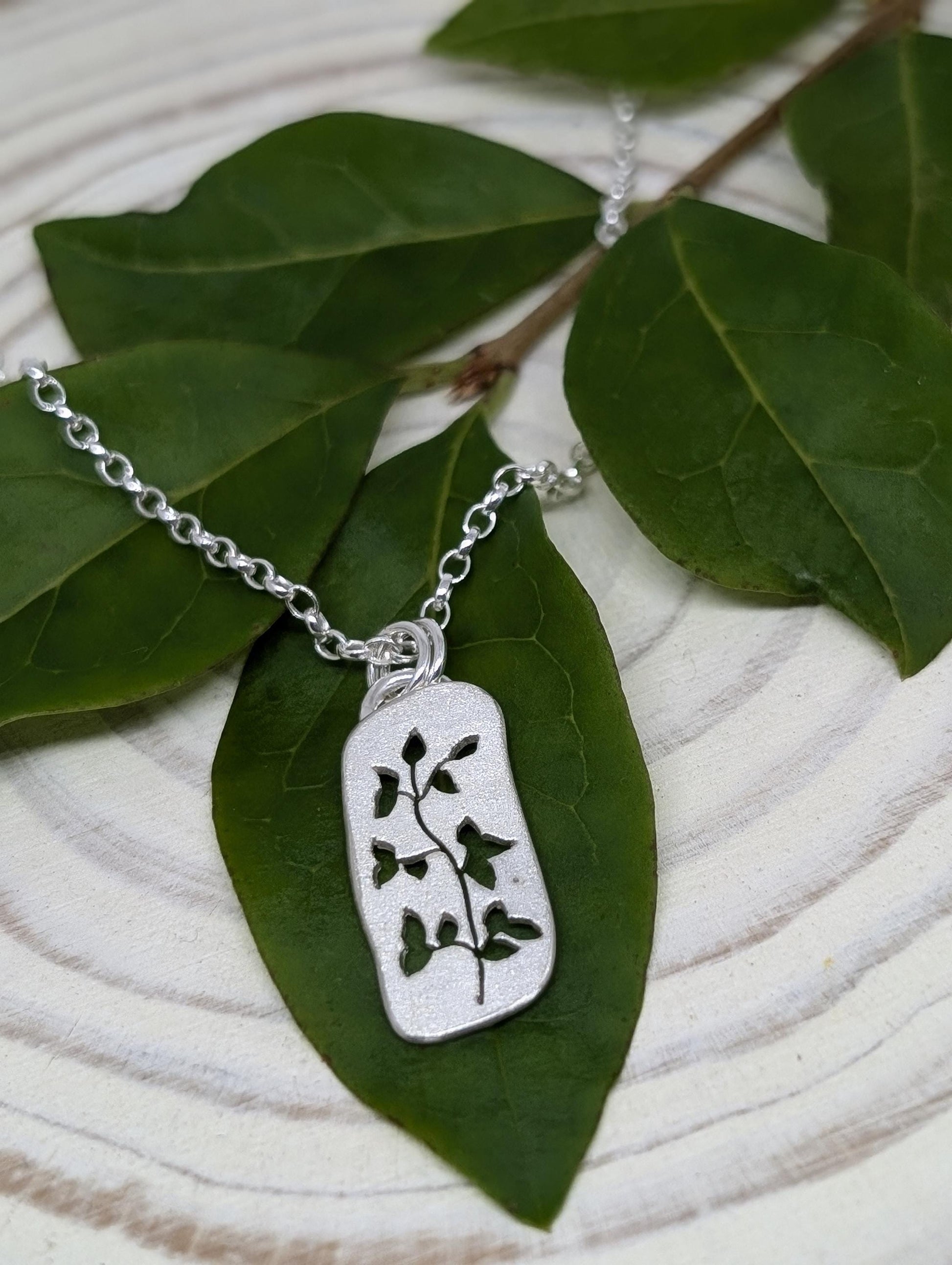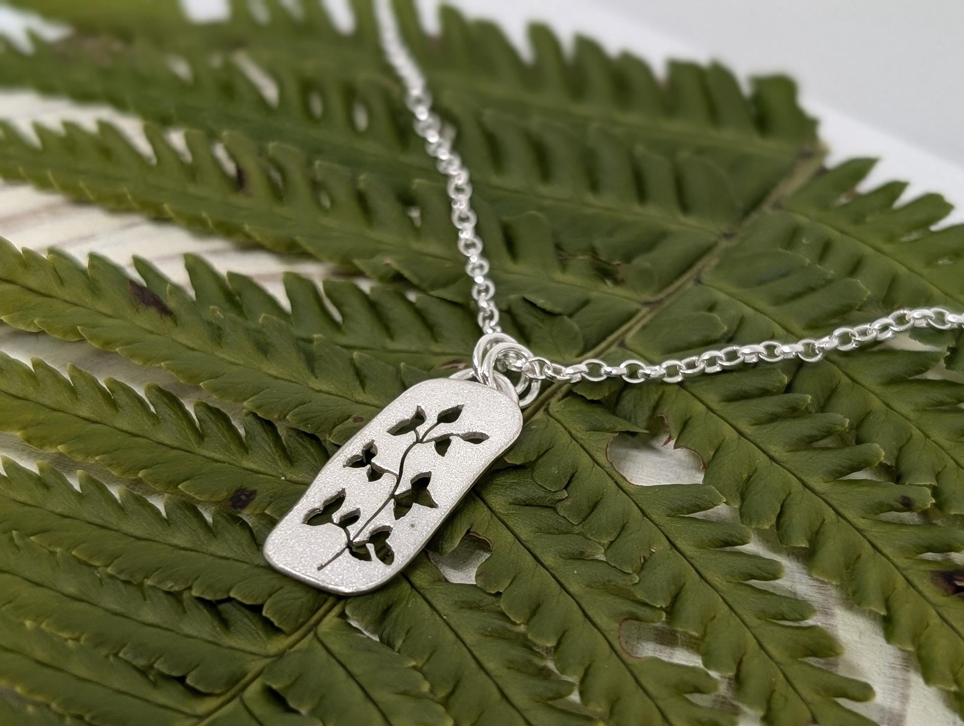 This stunning one-of-a-kind pendant features an intricate leafy branch which has been hand-cut out of sterling silver. I have kept the shape of the pendant organic to compliment the shape of the tree branch. The design of this piece has been inspired by walks through the forest and looking up into the canopies which silhouette the sky with branches and leaves.