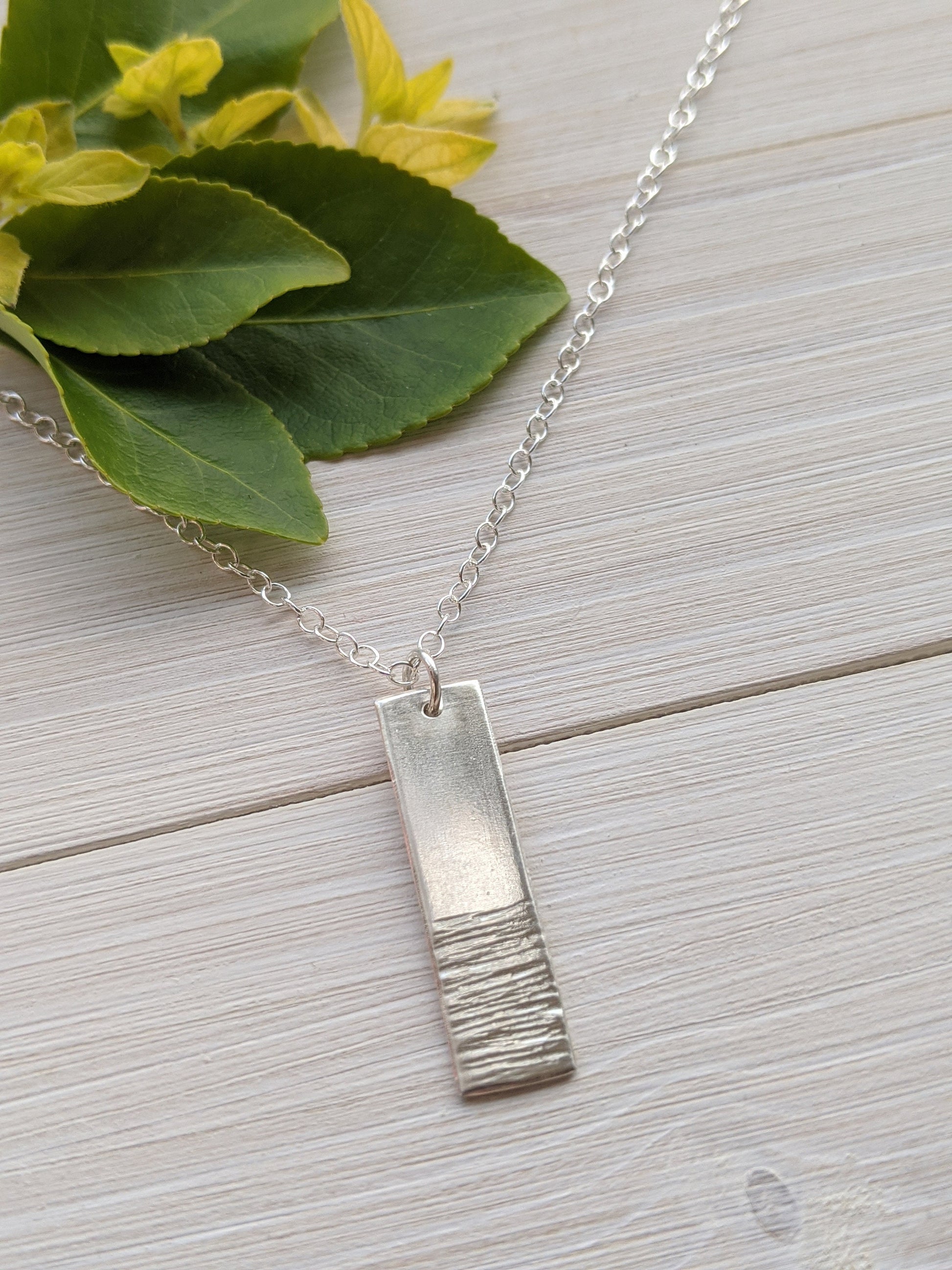 This simple but stylish silver bar pendant will go with any outfit to add subtle class and shine. 100% handmade from 925 sterling silver, it has been cut, textured and polished to a high shine. It is light and comfortable to wear all day long, for any occasion.