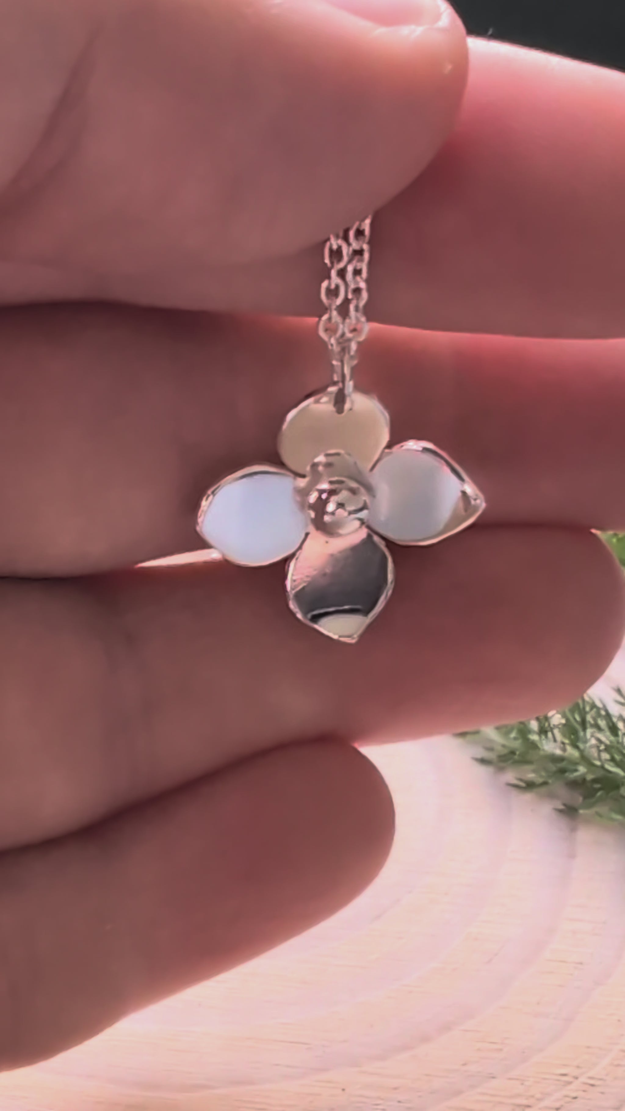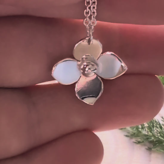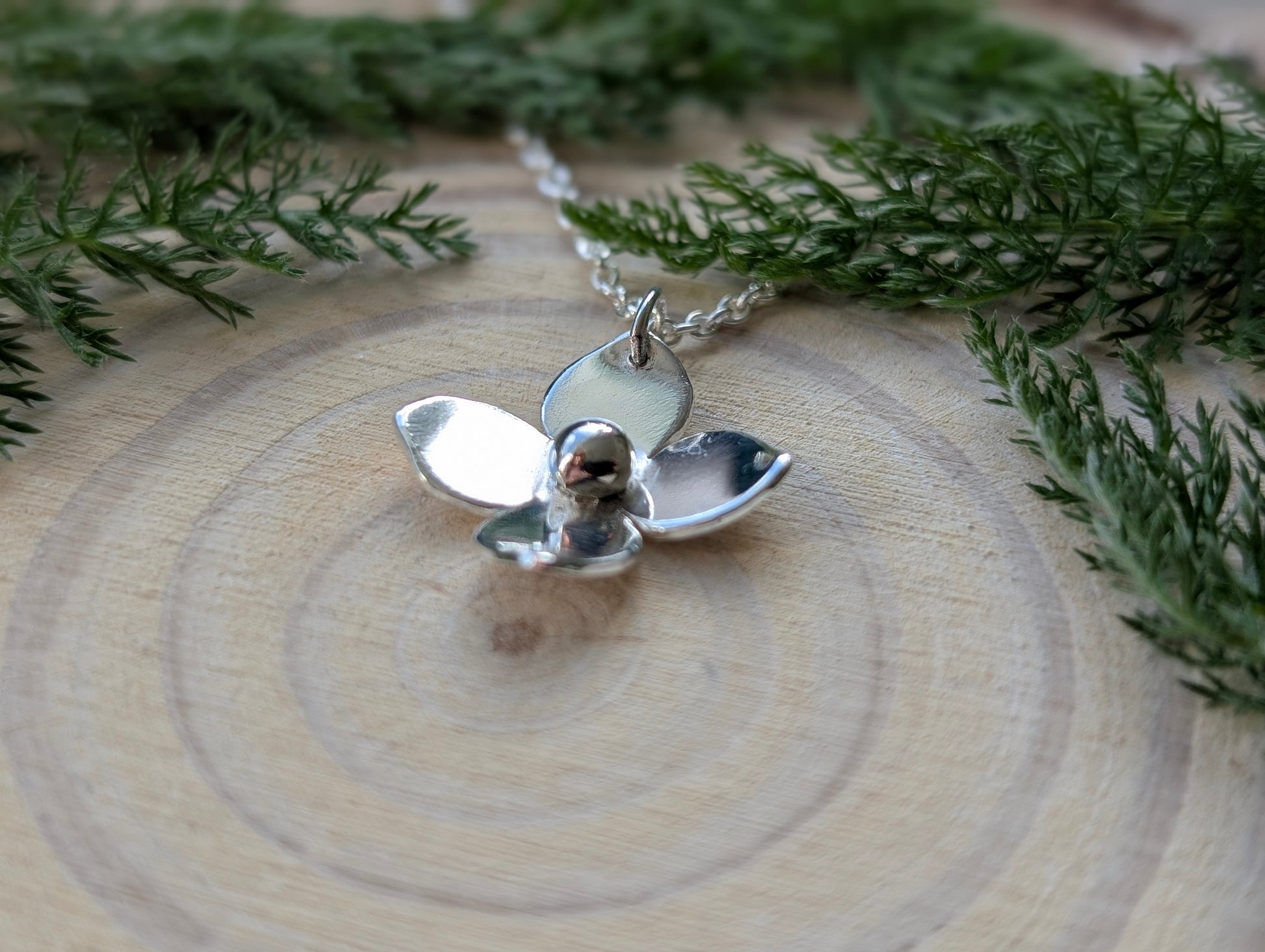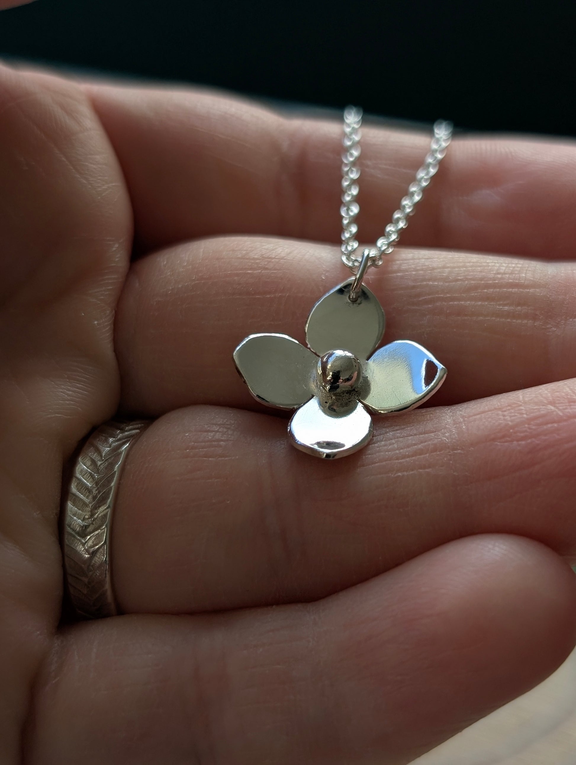 This unique little flower pendant has been hand sawn from sterling silver sheet and embellished with a silver ball in the centre. It sits on a sterling silver belcher chain which can be fastened at either 18 or 20 inches.
